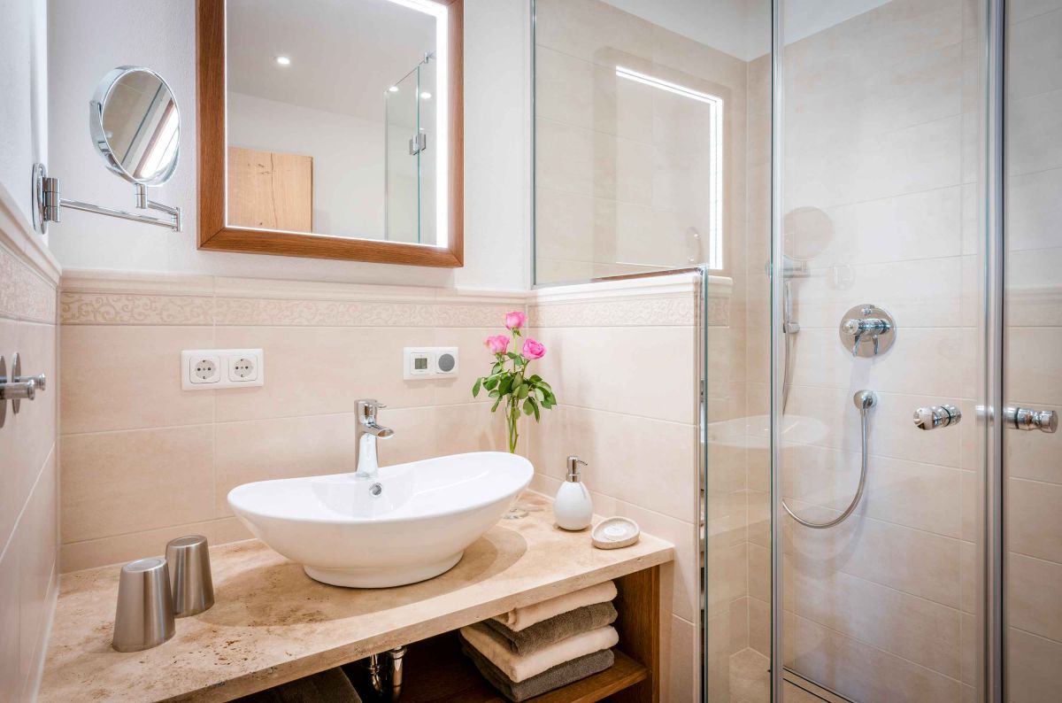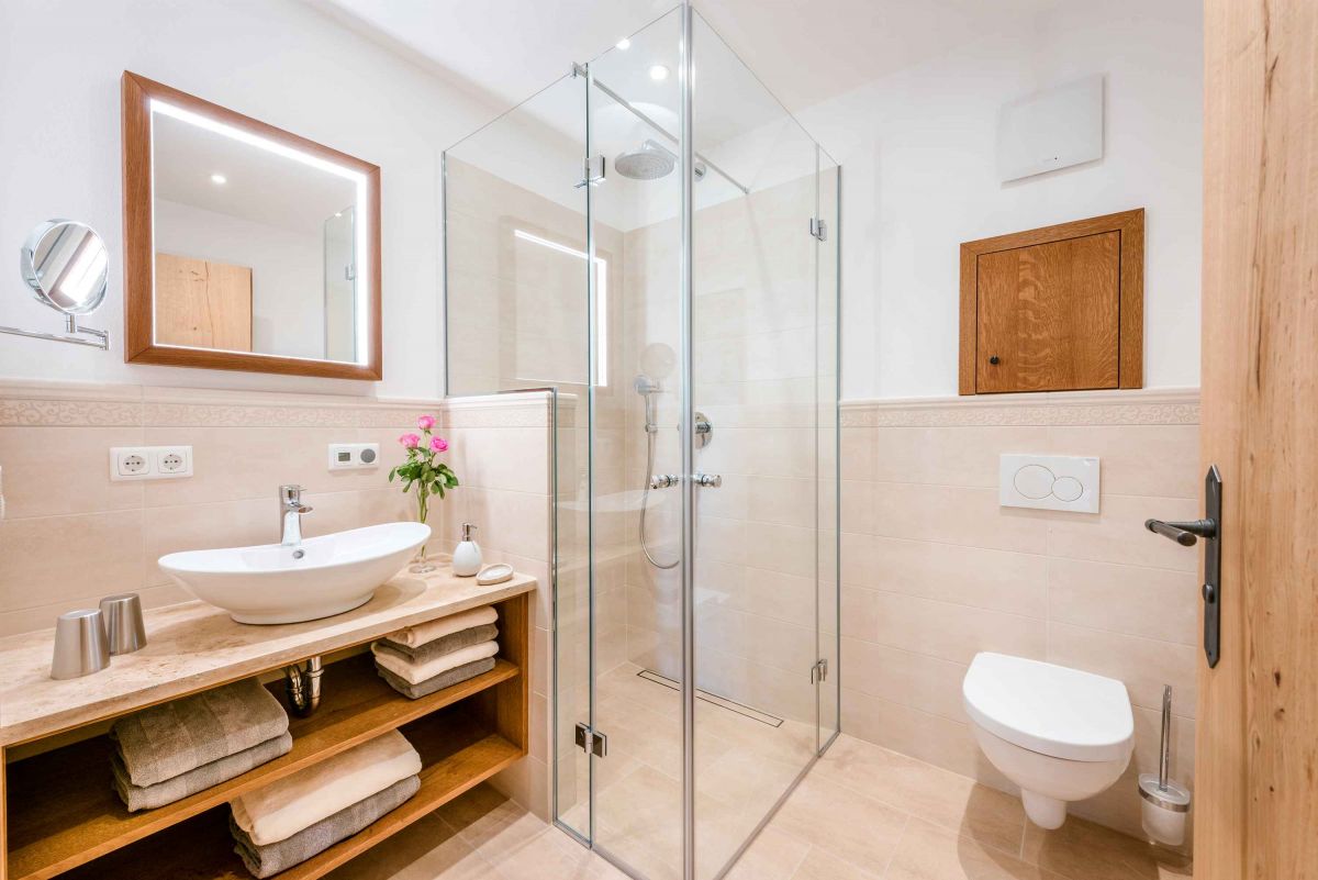 - 1 Badezimmer mit Regendusche, WC, Waschbecken, Handtuchwärmer, Schminkspiegel und Fön