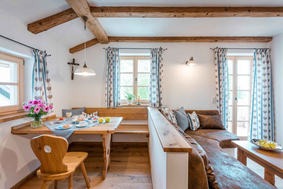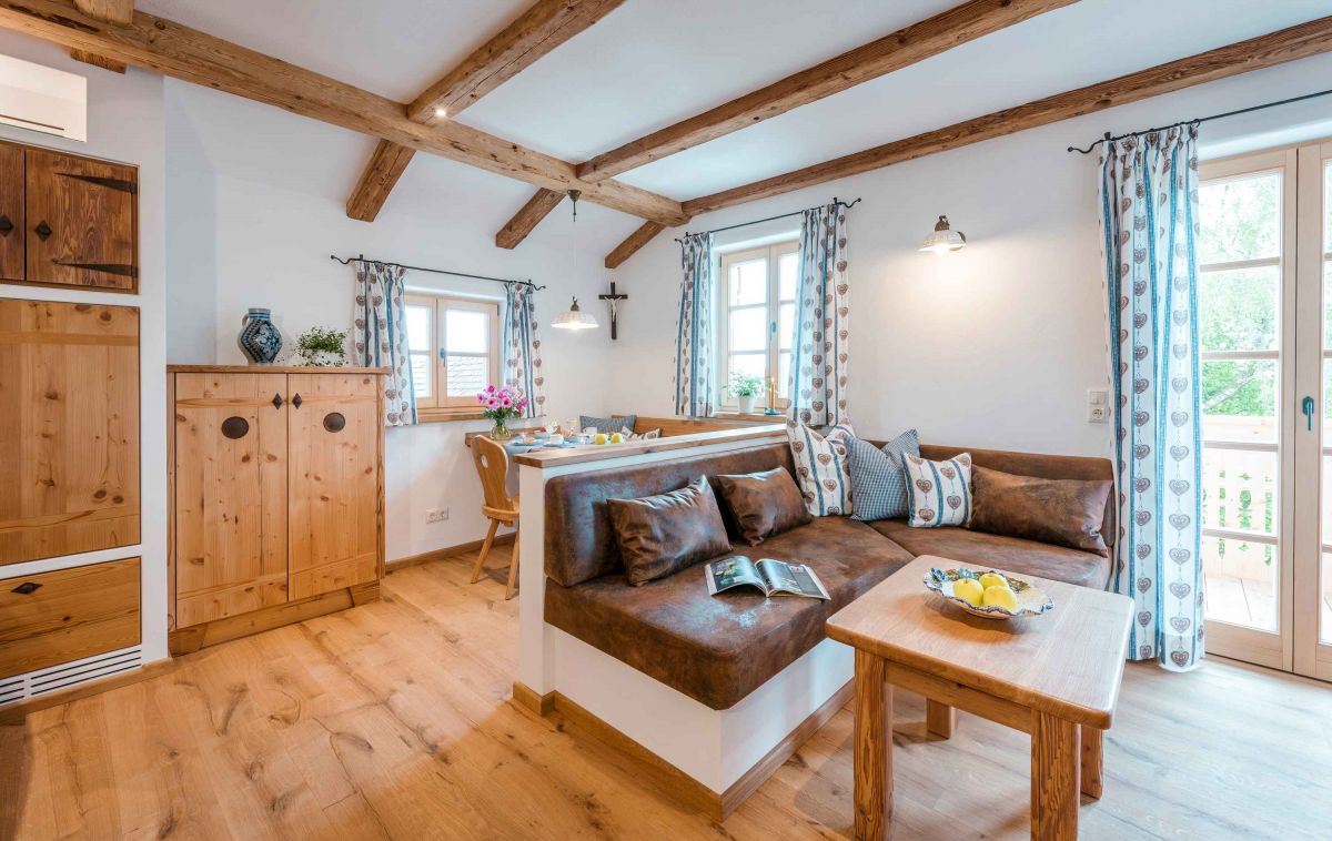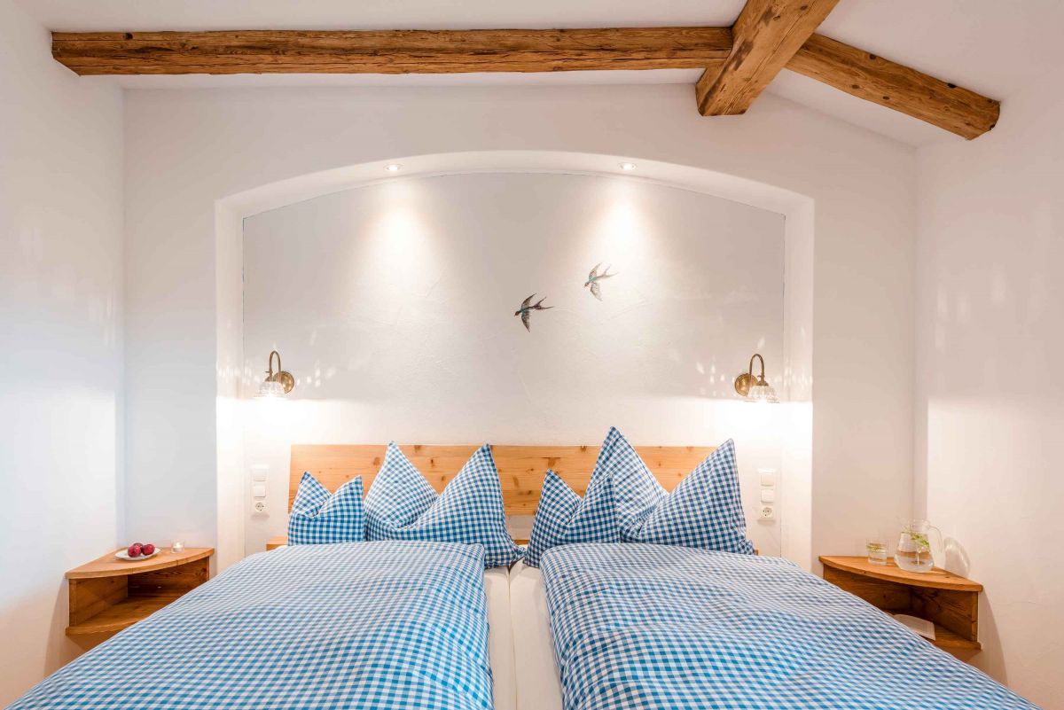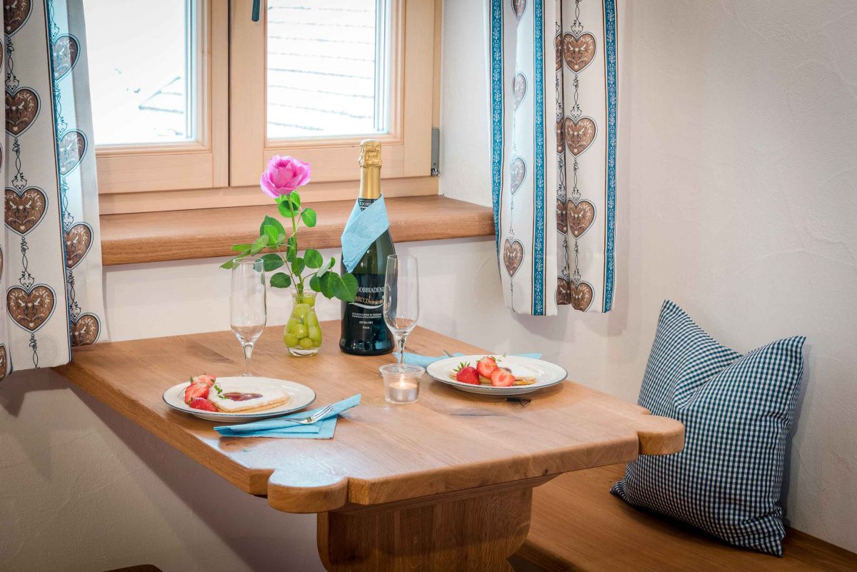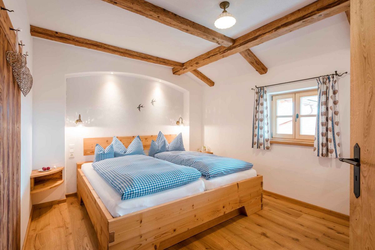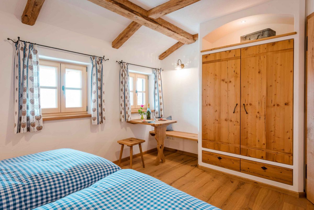 Die 5-Sterne-Luxus-Ferienwohnung "Schwalbennest" bietet mit einer Größe von etwa 45 qm reichlich Platz für bis zu 2 Personen. Die gemütlich eingerichtete Ferienwohnung befindet sich im zweiten Stock des neu erbauten Bauernhauses, ist komfortabel mit dem Lift zu erreichen, und besitzt einen Ostbalkon. Sie verfügt über ein Schlafzimmer mit Doppelbett. Die Küche wie auch die übrige Einrichtung wurde von Schreinern angefertigt. Details, Stoffe und Farben wurden von Bäuerin Evi liebevoll zum Wohlfühlen ausgewählt.