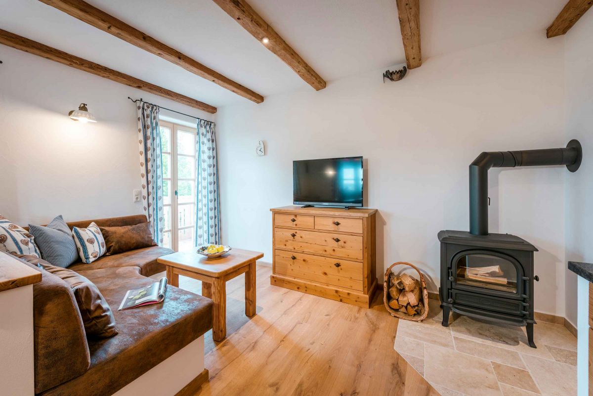 - Wohnbereich mit Kaminofen und gemütlicher Sitzecke mit Couch und Couchtisch