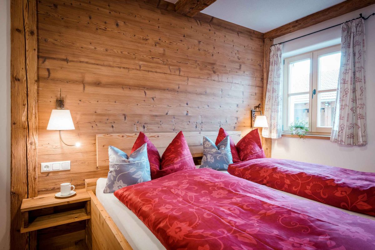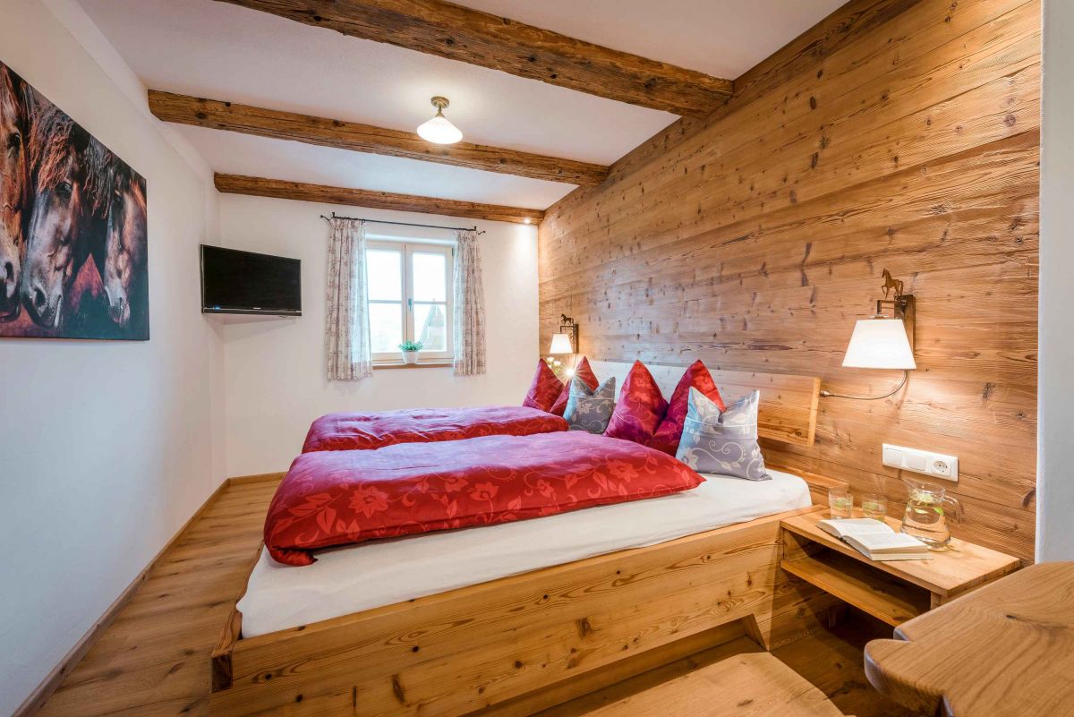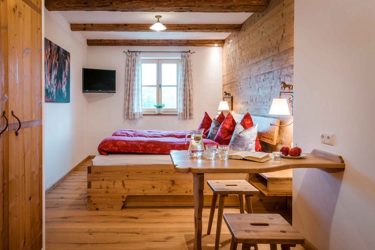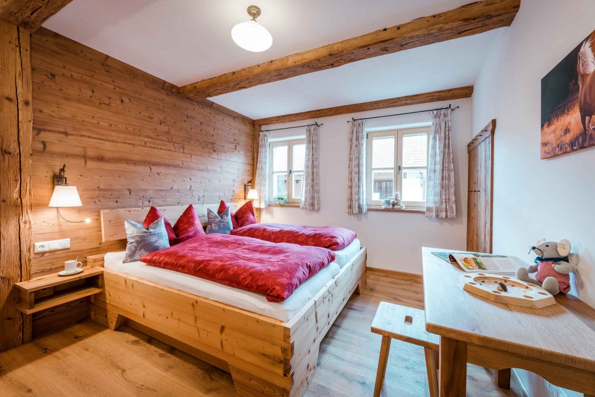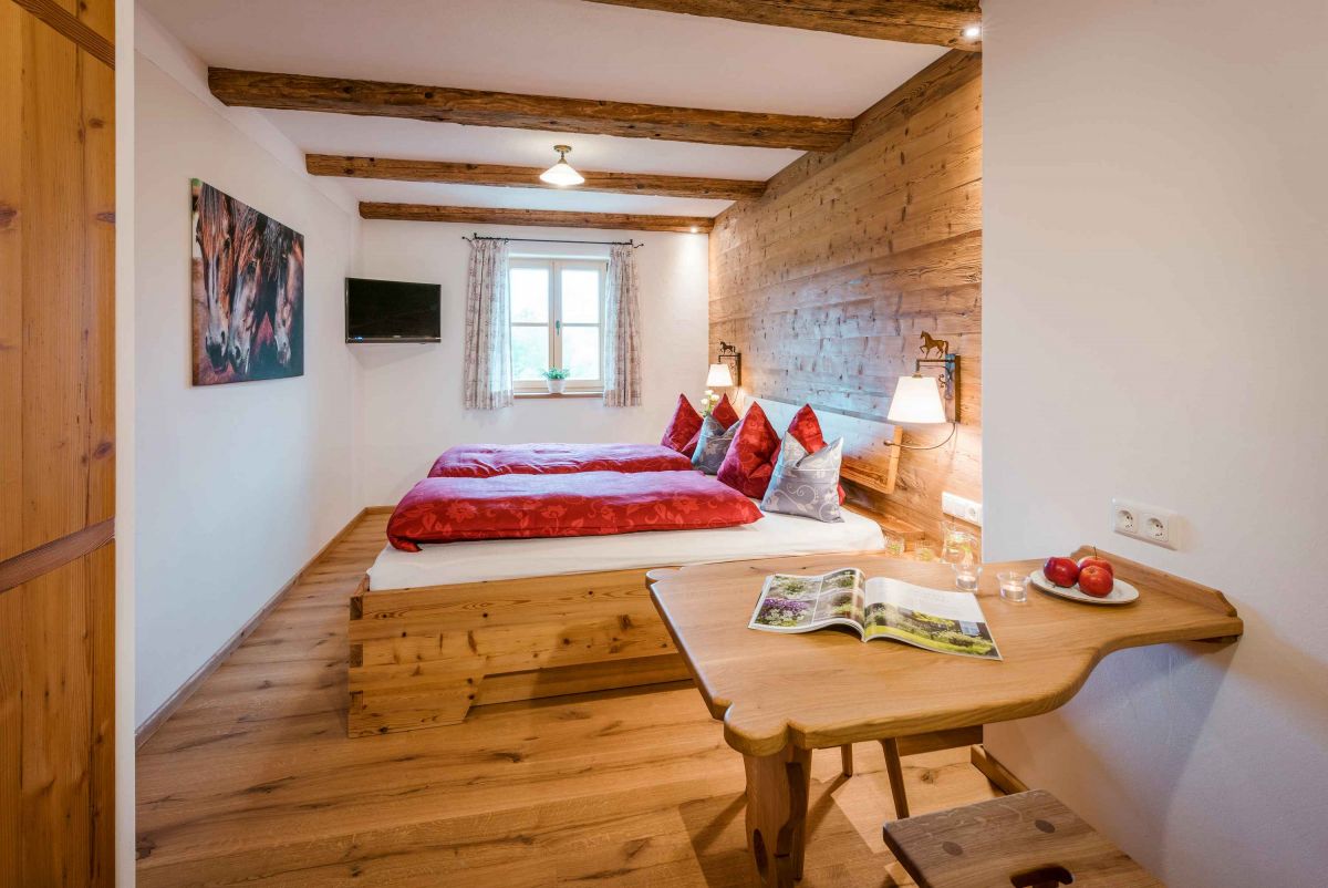 Die 5-Sterne-Luxus-Ferienwohnung " Zum Pferdestall" bietet mit einer Größe von etwa 96 qm reichlich Platz für bis zu 5 Personen. Die gemütlich eingerichtete Ferienwohnung befindet sich im ersten Stock des neu erbauten Bauernhauses, ist komfortabel mit dem Lift zu erreichen, und besitzt einen Südwestbalkon. Sie verfügt über zwei getrennte Schlafzimmer: ein Elternschlafzimmer mit Doppelbett sowie ein Kinderzimmer mit Doppelbett und Hochbett. Die Küche wie auch die übrige Einrichtung wurde von Schreinern angefertigt. Details, Stoffe und Farben wurden von Bäuerin Evi liebevoll zum Wohlfühlen ausgewählt.