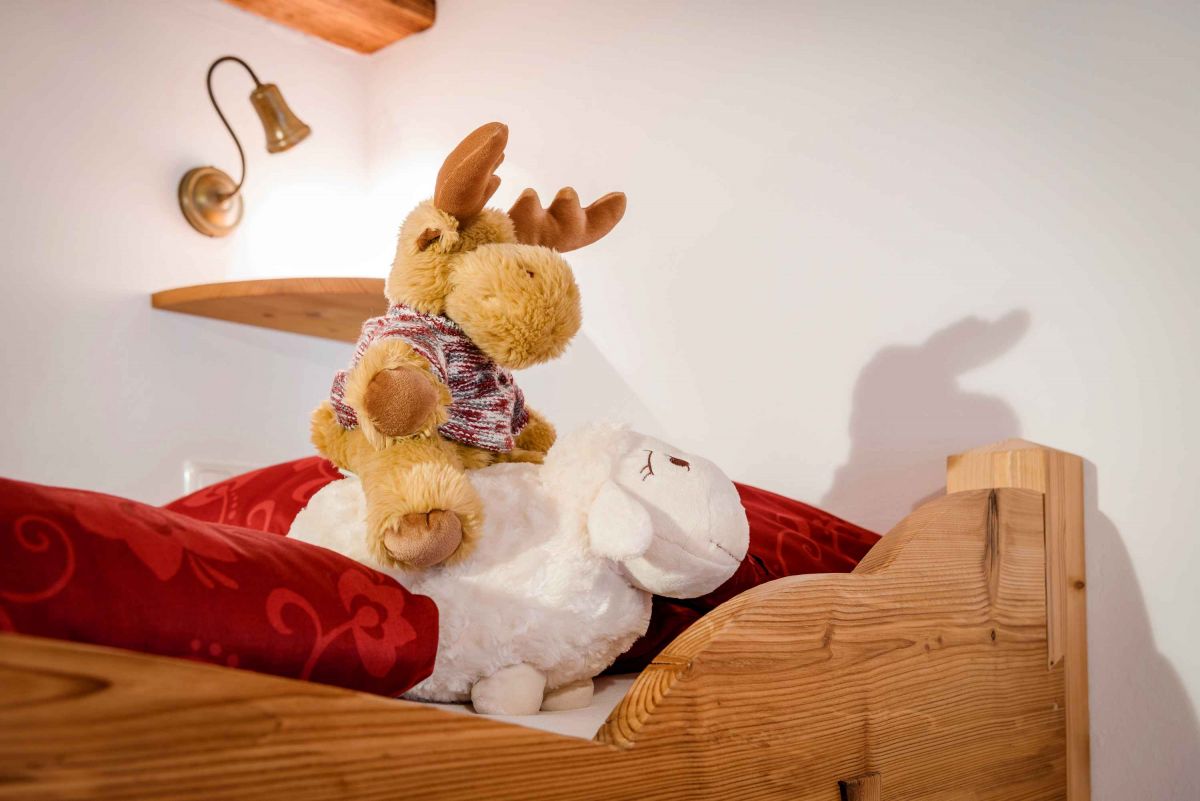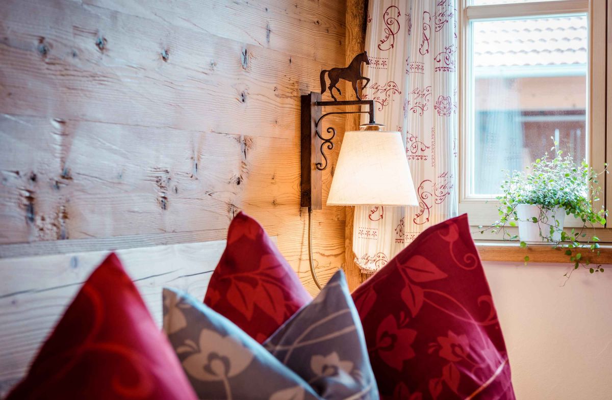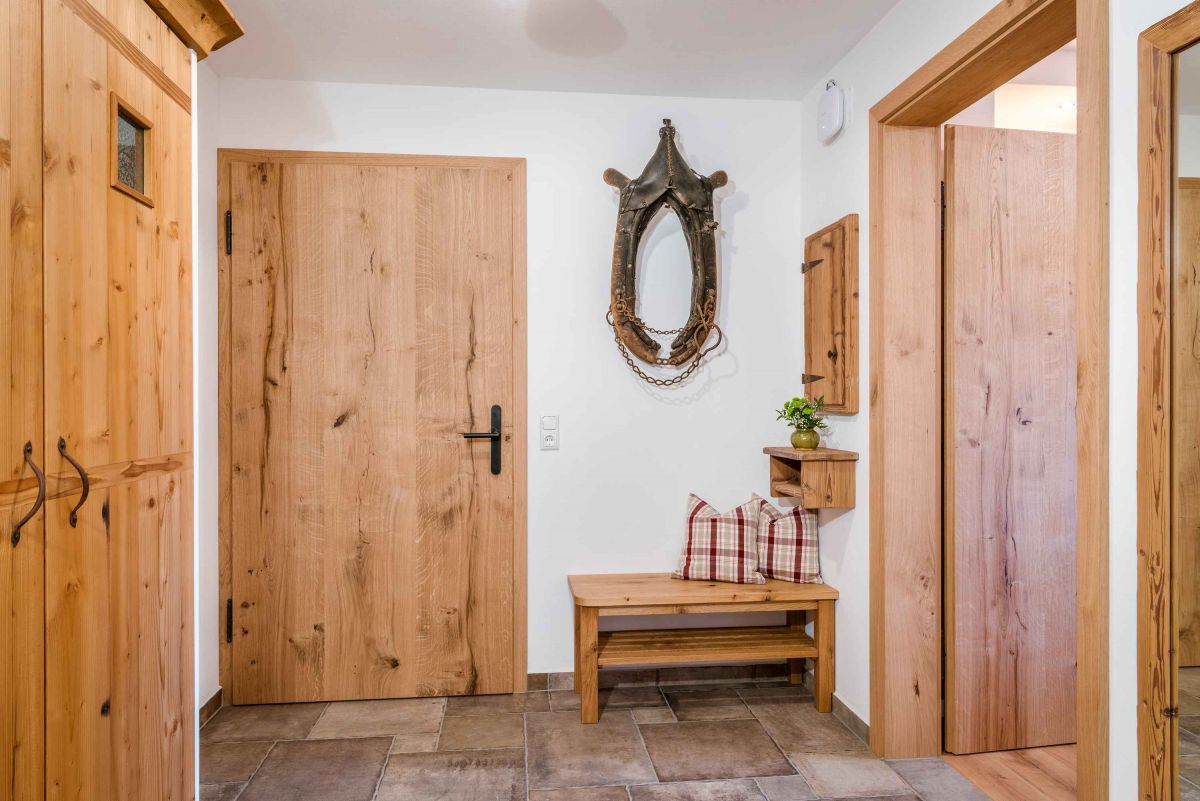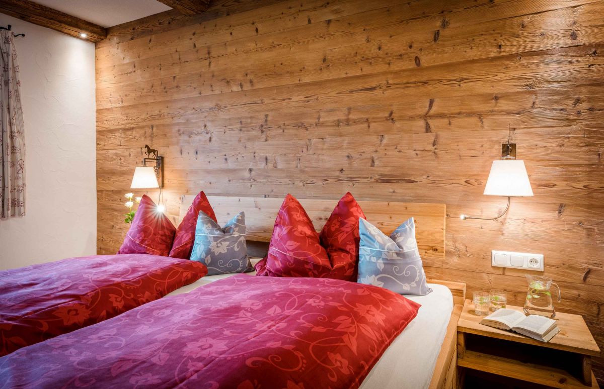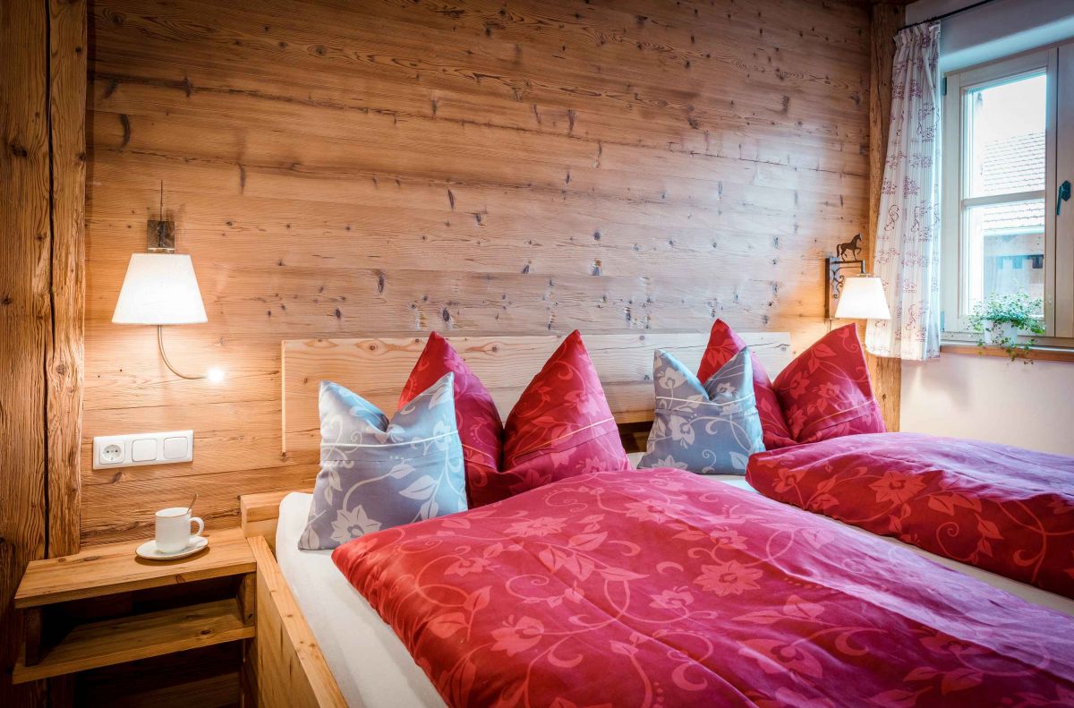 Die 5-Sterne-Luxus-Ferienwohnung " Zum Pferdestall" bietet mit einer Größe von etwa 96 qm reichlich Platz für bis zu 5 Personen. Die gemütlich eingerichtete Ferienwohnung befindet sich im ersten Stock des neu erbauten Bauernhauses, ist komfortabel mit dem Lift zu erreichen, und besitzt einen Südwestbalkon. Sie verfügt über zwei getrennte Schlafzimmer: ein Elternschlafzimmer mit Doppelbett sowie ein Kinderzimmer mit Doppelbett und Hochbett. Die Küche wie auch die übrige Einrichtung wurde von Schreinern angefertigt. Details, Stoffe und Farben wurden von Bäuerin Evi liebevoll zum Wohlfühlen ausgewählt.