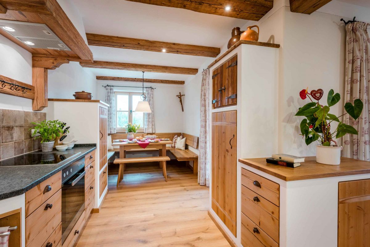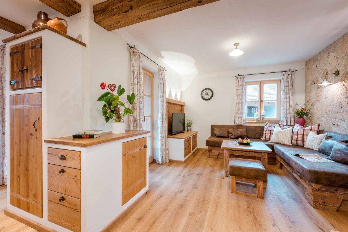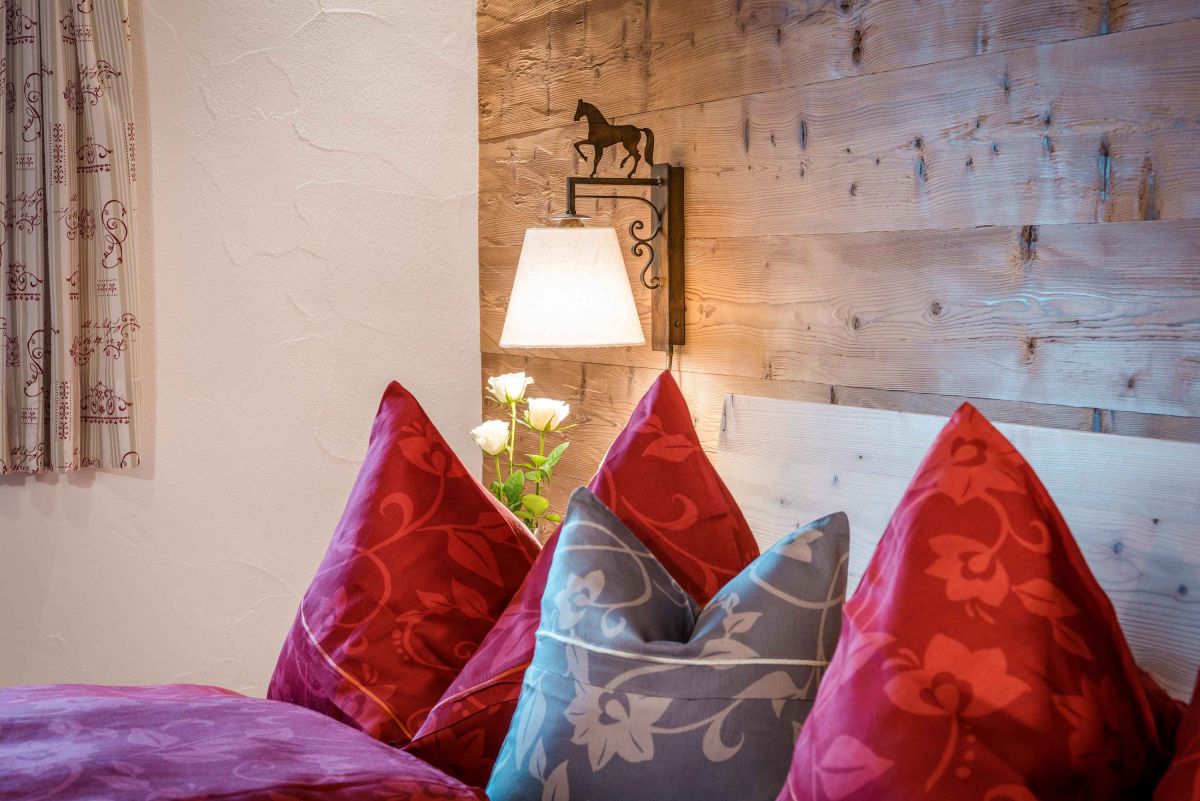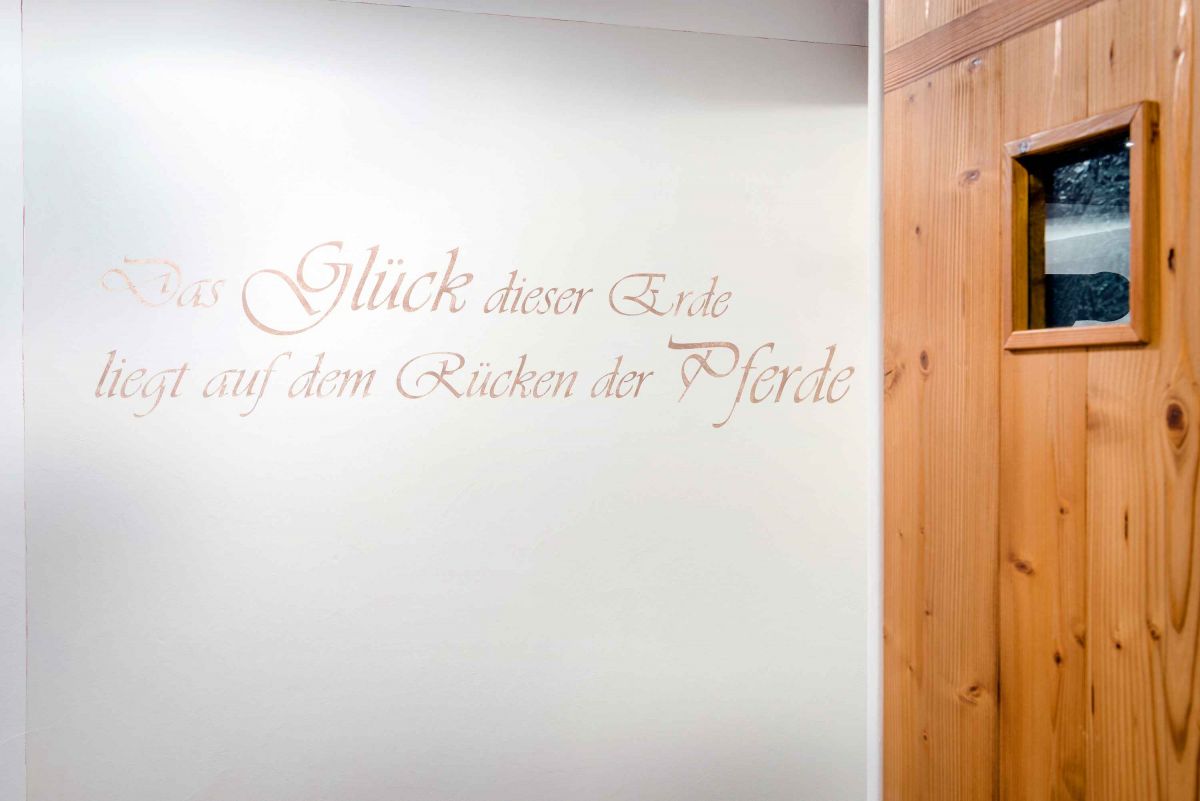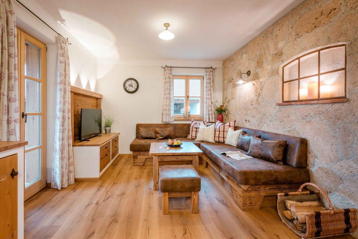 Die 5-Sterne-Luxus-Ferienwohnung " Zum Pferdestall" bietet mit einer Größe von etwa 96 qm reichlich Platz für bis zu 5 Personen. Die gemütlich eingerichtete Ferienwohnung befindet sich im ersten Stock des neu erbauten Bauernhauses, ist komfortabel mit dem Lift zu erreichen, und besitzt einen Südwestbalkon. Sie verfügt über zwei getrennte Schlafzimmer: ein Elternschlafzimmer mit Doppelbett sowie ein Kinderzimmer mit Doppelbett und Hochbett. Die Küche wie auch die übrige Einrichtung wurde von Schreinern angefertigt. Details, Stoffe und Farben wurden von Bäuerin Evi liebevoll zum Wohlfühlen ausgewählt.