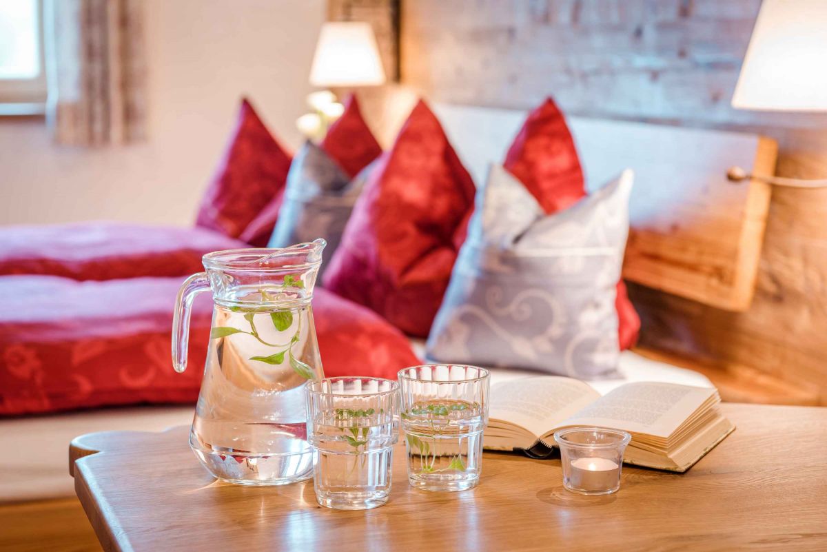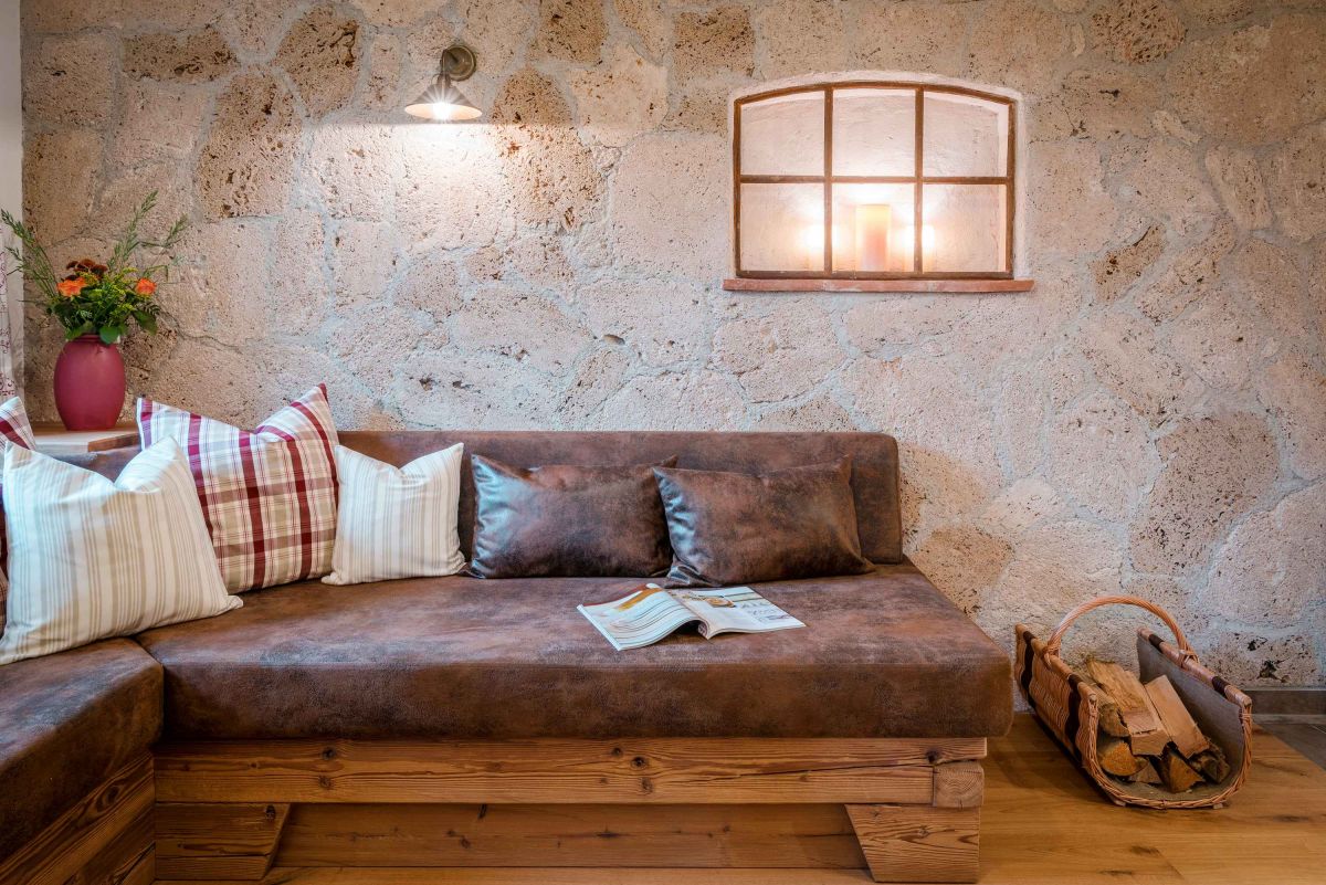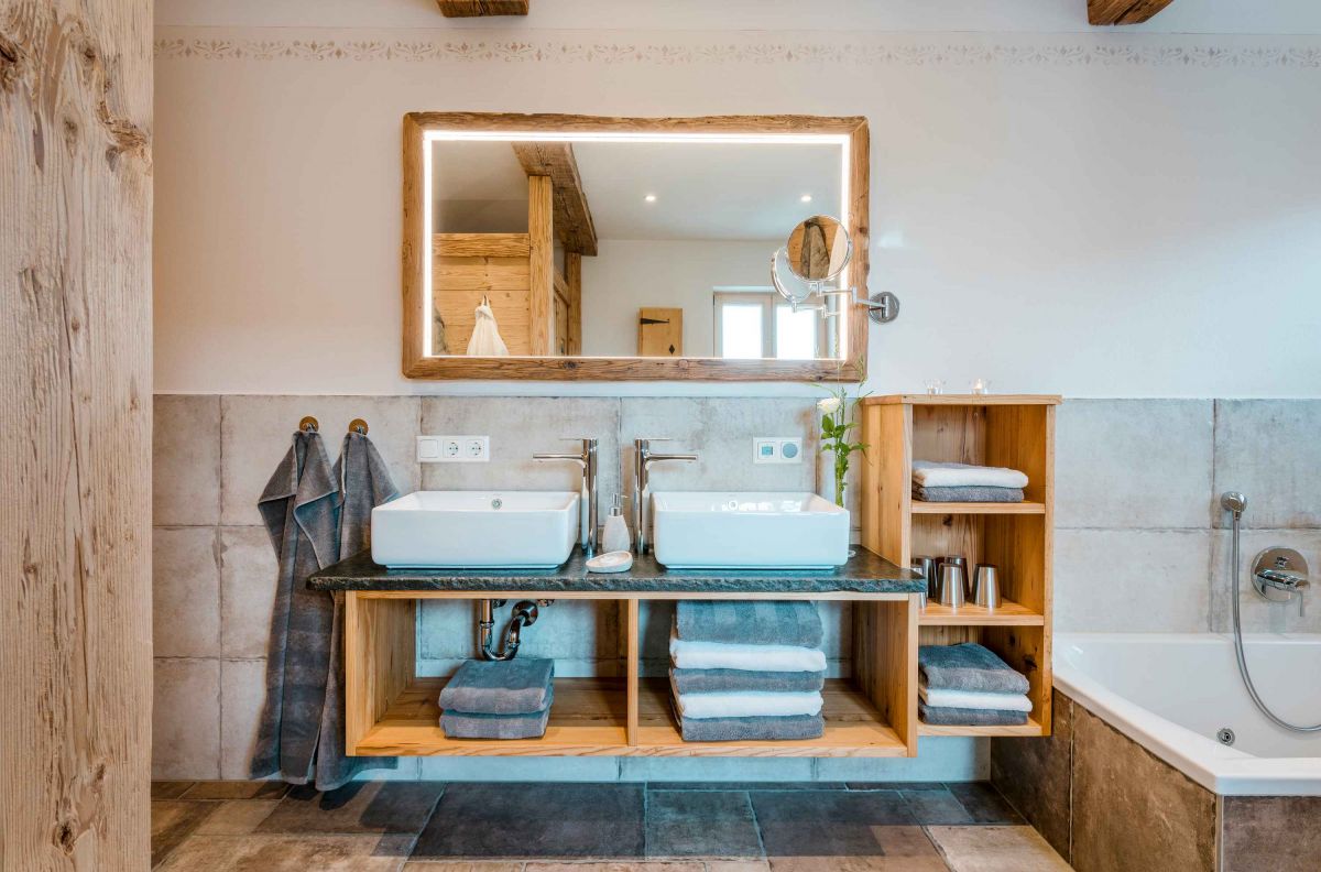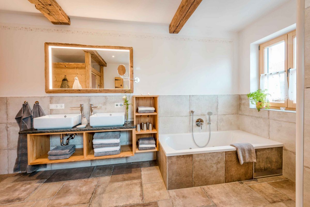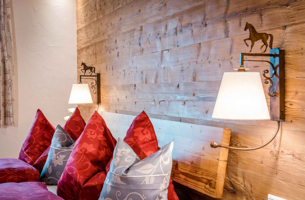 Die 5-Sterne-Luxus-Ferienwohnung " Zum Pferdestall" bietet mit einer Größe von etwa 96 qm reichlich Platz für bis zu 5 Personen. Die gemütlich eingerichtete Ferienwohnung befindet sich im ersten Stock des neu erbauten Bauernhauses, ist komfortabel mit dem Lift zu erreichen, und besitzt einen Südwestbalkon. Sie verfügt über zwei getrennte Schlafzimmer: ein Elternschlafzimmer mit Doppelbett sowie ein Kinderzimmer mit Doppelbett und Hochbett. Die Küche wie auch die übrige Einrichtung wurde von Schreinern angefertigt. Details, Stoffe und Farben wurden von Bäuerin Evi liebevoll zum Wohlfühlen ausgewählt.