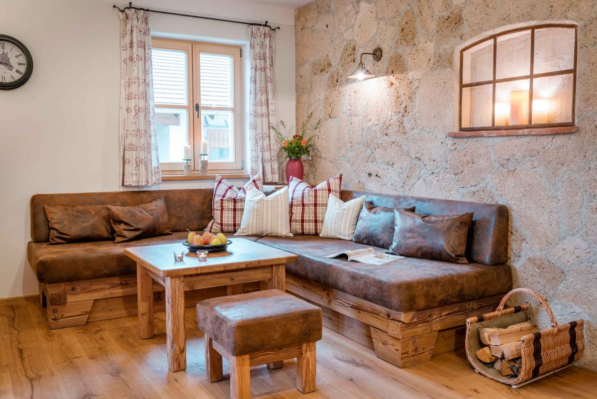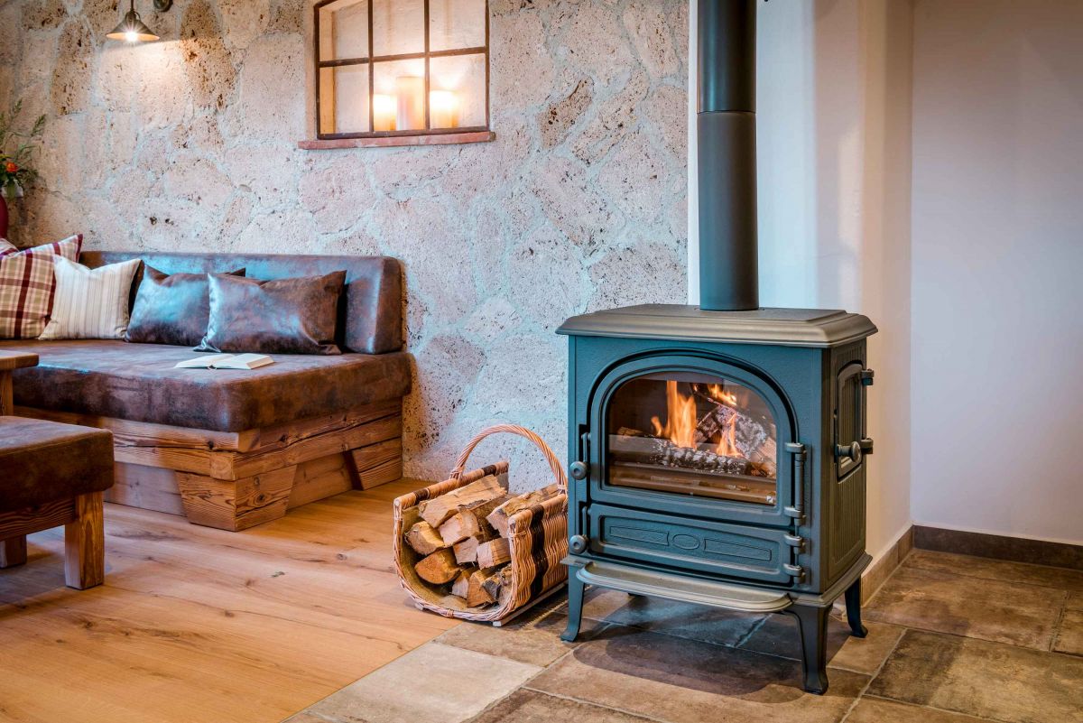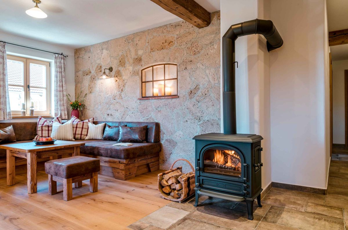 - Wohnbereich mit Kaminofen und gemütlicher Sitzecke mit Couch und Couchtisch