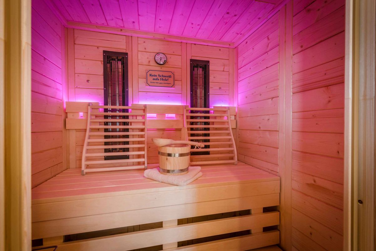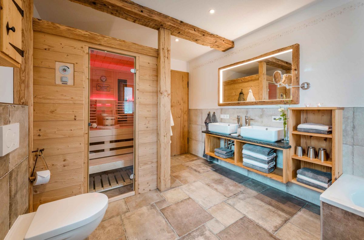 - 1 Badezimmer mit Regendusche, finnischer Sauna inklusive VITAL-light-Infrarot-ABC-Strahler und Farblicht-Therapie, Whirlwanne mit Sprudel- und Massagedüsen, WC, zwei Waschbecken, Handtuchwärmer, Schminkspiegel und Fön