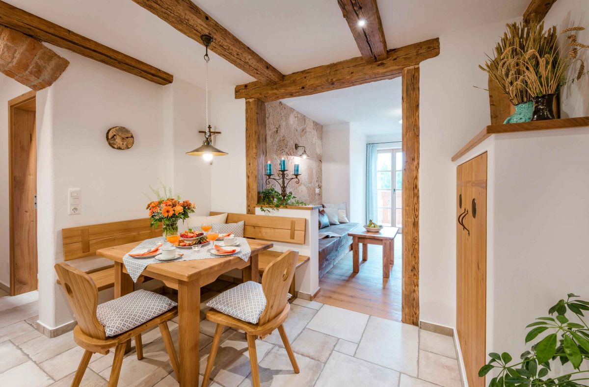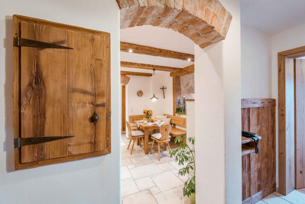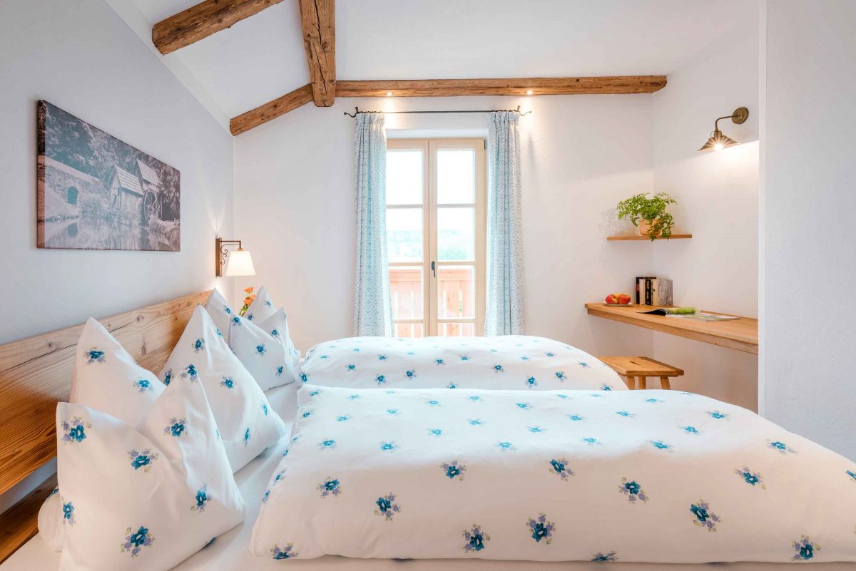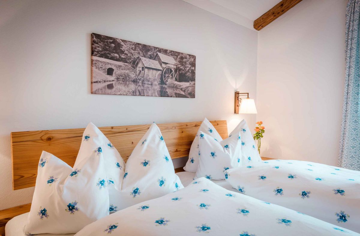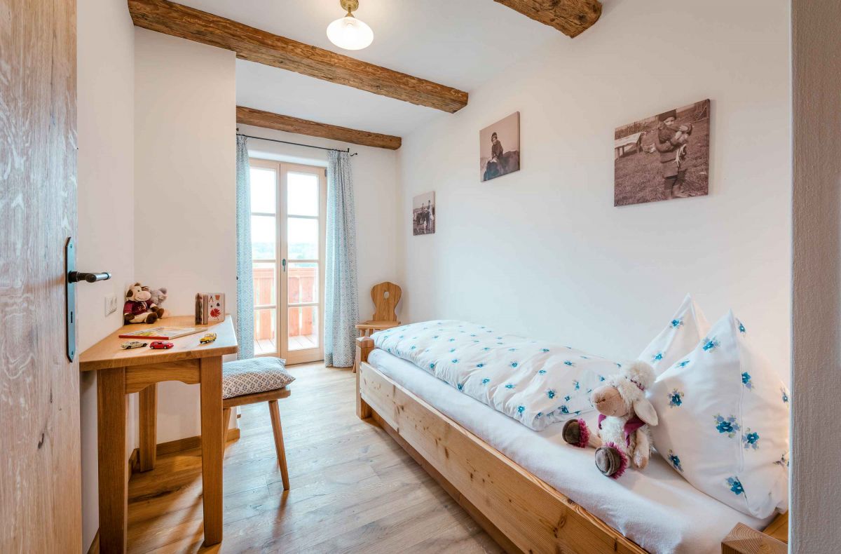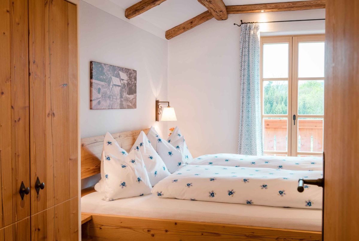 Die 5-Sterne-Luxus-Ferienwohnung "Zur Mühle" bietet mit einer Größe von etwa 61 qm reichlich Platz für bis zu 3 Personen. Die gemütlich eingerichtete Ferienwohnung befindet sich im zweiten Stock des neu erbauten Bauernhauses, ist komfortabel mit dem Lift zu erreichen, und besitzt einen Südwestbalkon. Sie verfügt über zwei getrennte Schlafzimmer: ein Elternschlafzimmer mit Doppelbett sowie ein Kinderzimmer mit Einzelbett, ein Zustellbett im Kinderzimmer ist möglich (Einzelbett wird zum Etagenbett). Die Küche wie auch die übrige Einrichtung wurde von Schreinern angefertigt. Details, Stoffe und Farben wurden von Bäuerin Evi liebevoll zum Wohlfühlen ausgewählt.