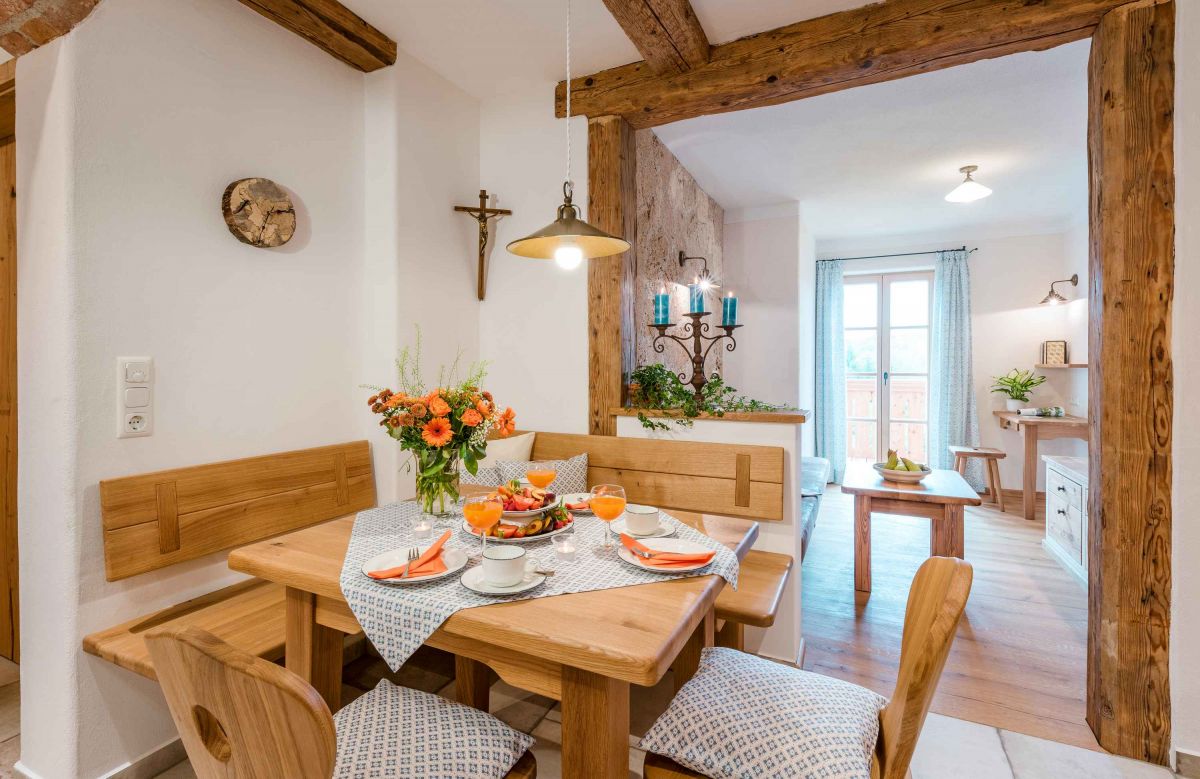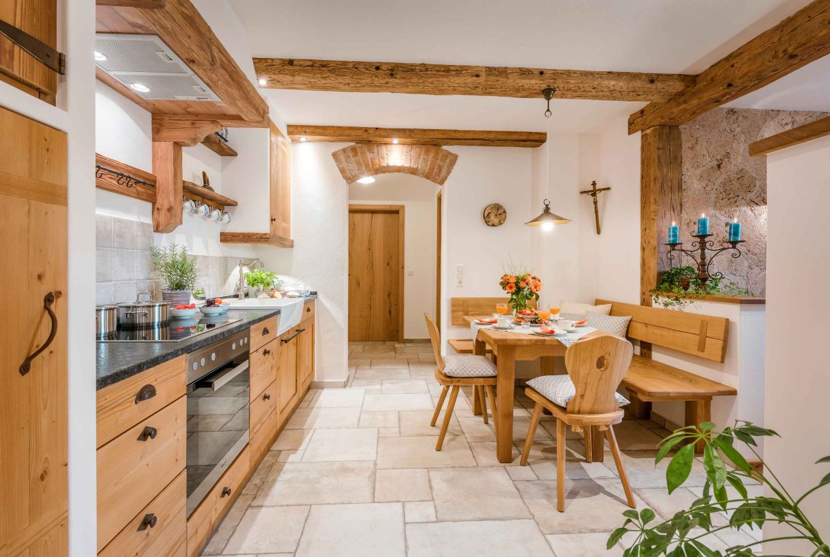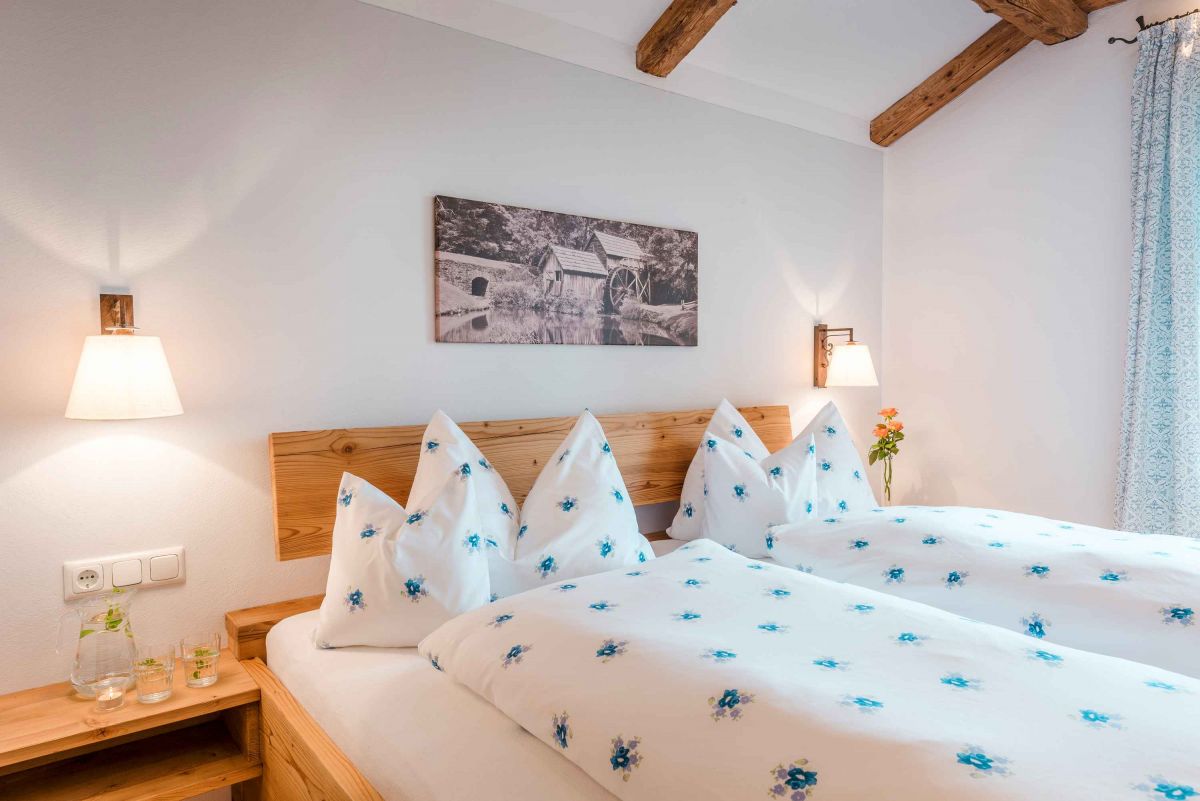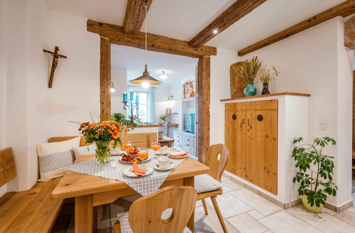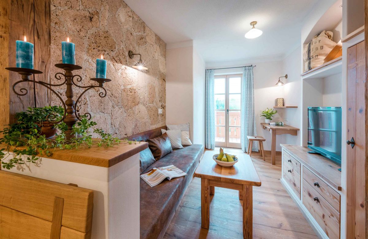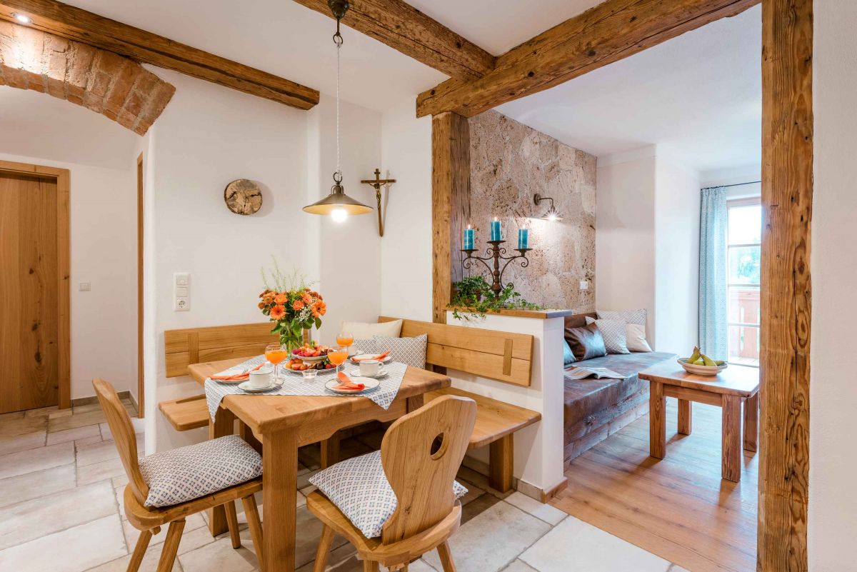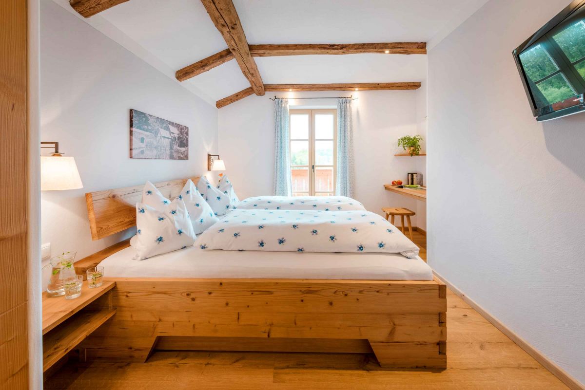 Die 5-Sterne-Luxus-Ferienwohnung "Zur Mühle" bietet mit einer Größe von etwa 61 qm reichlich Platz für bis zu 3 Personen. Die gemütlich eingerichtete Ferienwohnung befindet sich im zweiten Stock des neu erbauten Bauernhauses, ist komfortabel mit dem Lift zu erreichen, und besitzt einen Südwestbalkon. Sie verfügt über zwei getrennte Schlafzimmer: ein Elternschlafzimmer mit Doppelbett sowie ein Kinderzimmer mit Einzelbett, ein Zustellbett im Kinderzimmer ist möglich (Einzelbett wird zum Etagenbett). Die Küche wie auch die übrige Einrichtung wurde von Schreinern angefertigt. Details, Stoffe und Farben wurden von Bäuerin Evi liebevoll zum Wohlfühlen ausgewählt.