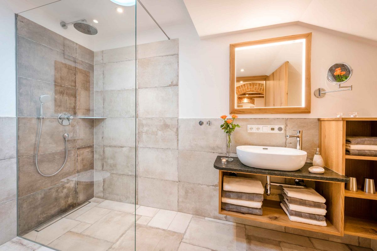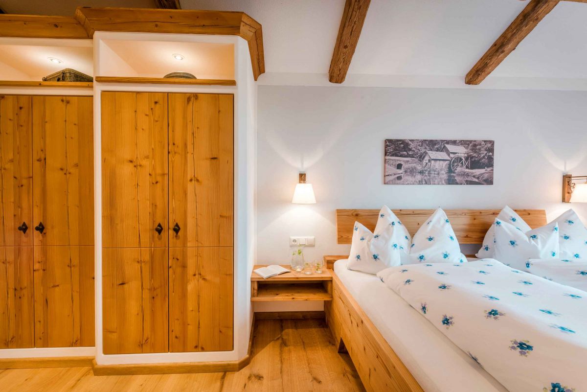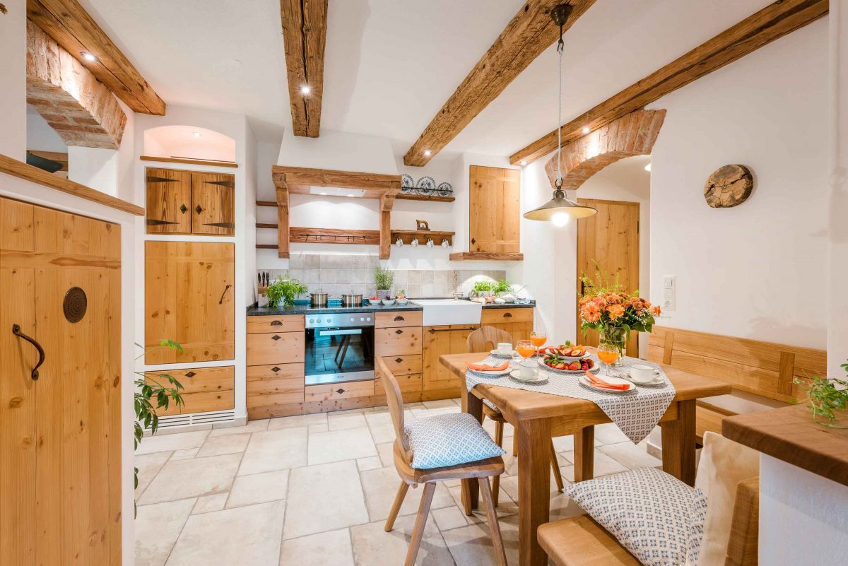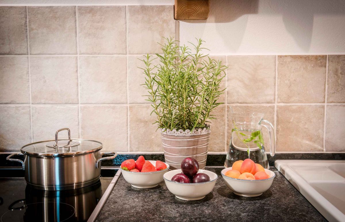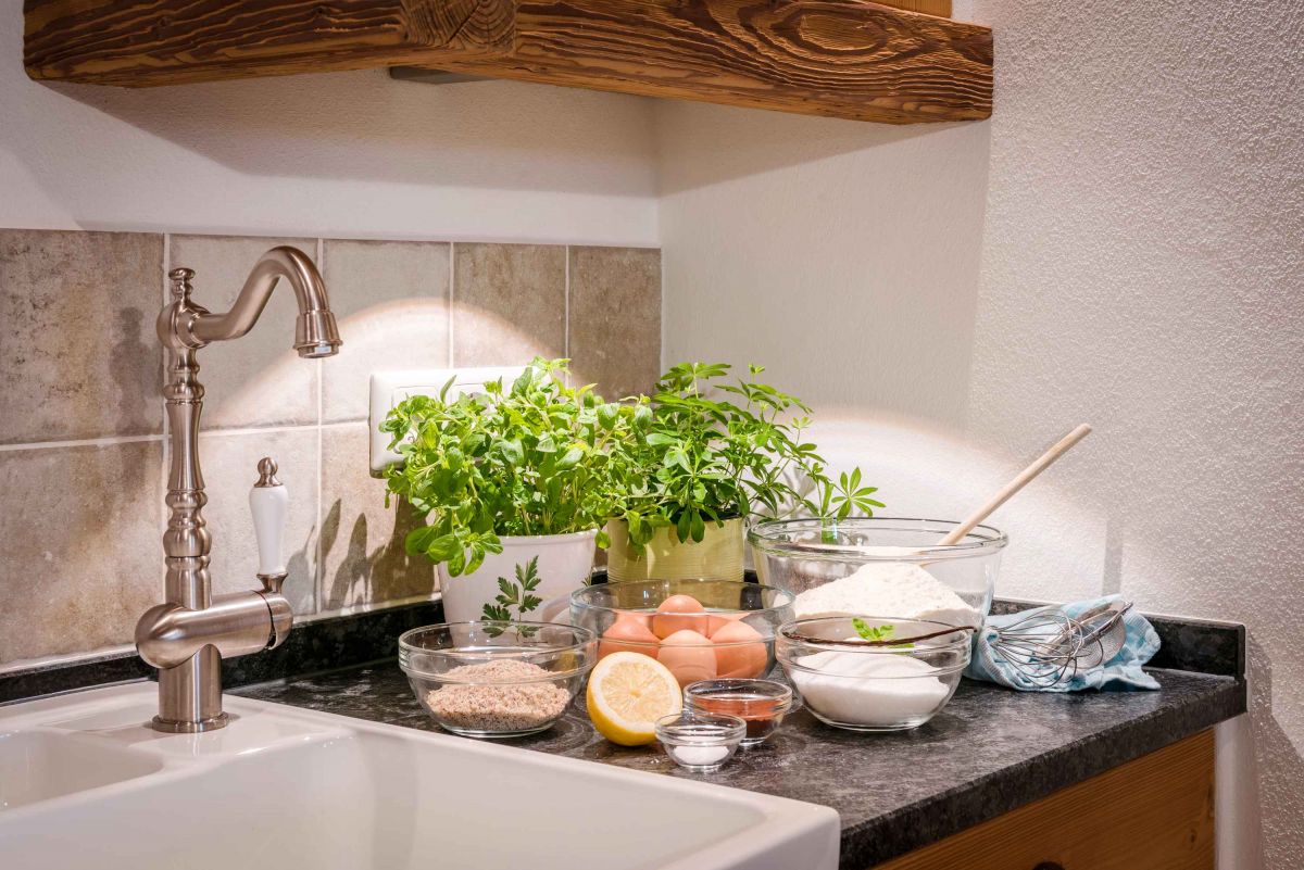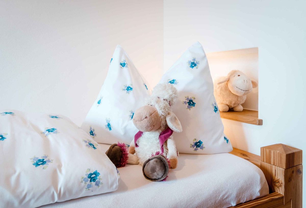 Die 5-Sterne-Luxus-Ferienwohnung "Zur Mühle" bietet mit einer Größe von etwa 61 qm reichlich Platz für bis zu 3 Personen. Die gemütlich eingerichtete Ferienwohnung befindet sich im zweiten Stock des neu erbauten Bauernhauses, ist komfortabel mit dem Lift zu erreichen, und besitzt einen Südwestbalkon. Sie verfügt über zwei getrennte Schlafzimmer: ein Elternschlafzimmer mit Doppelbett sowie ein Kinderzimmer mit Einzelbett, ein Zustellbett im Kinderzimmer ist möglich (Einzelbett wird zum Etagenbett). Die Küche wie auch die übrige Einrichtung wurde von Schreinern angefertigt. Details, Stoffe und Farben wurden von Bäuerin Evi liebevoll zum Wohlfühlen ausgewählt.