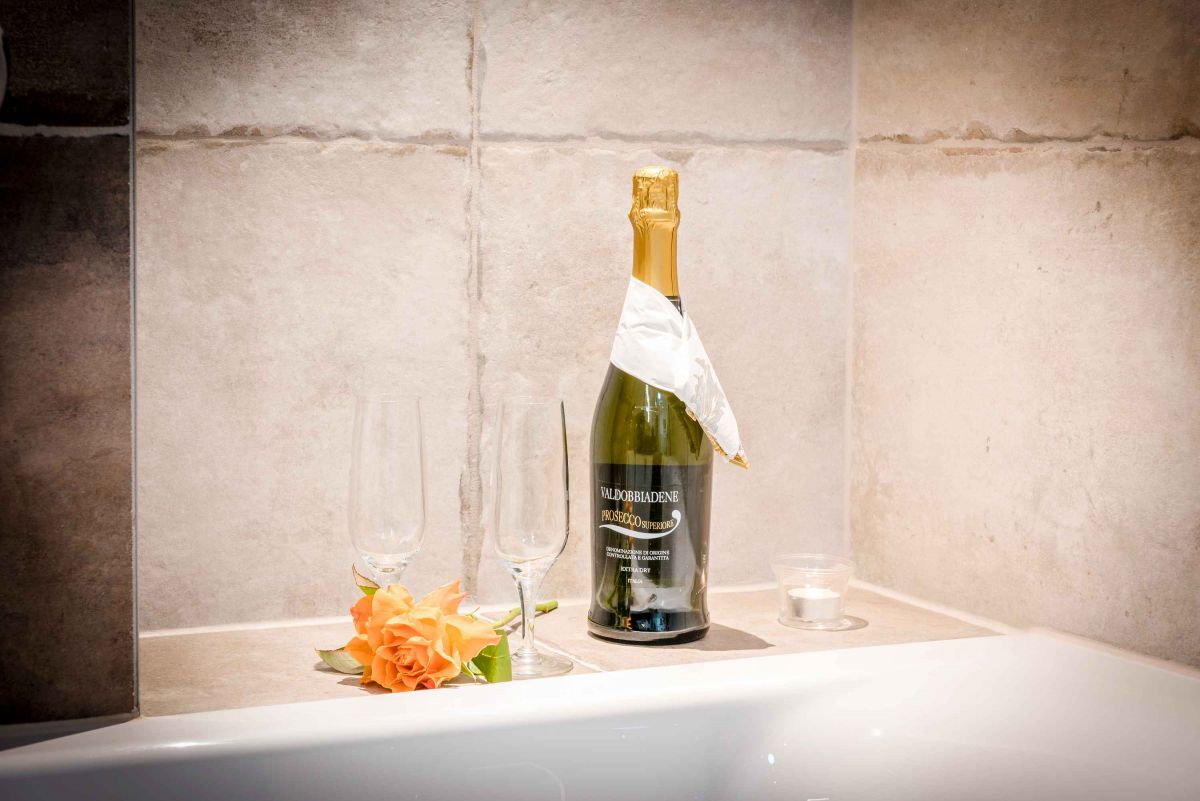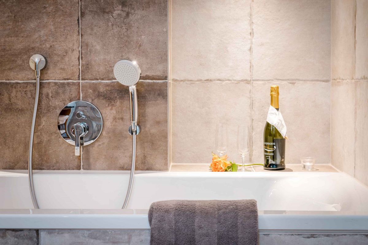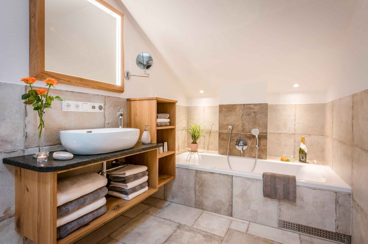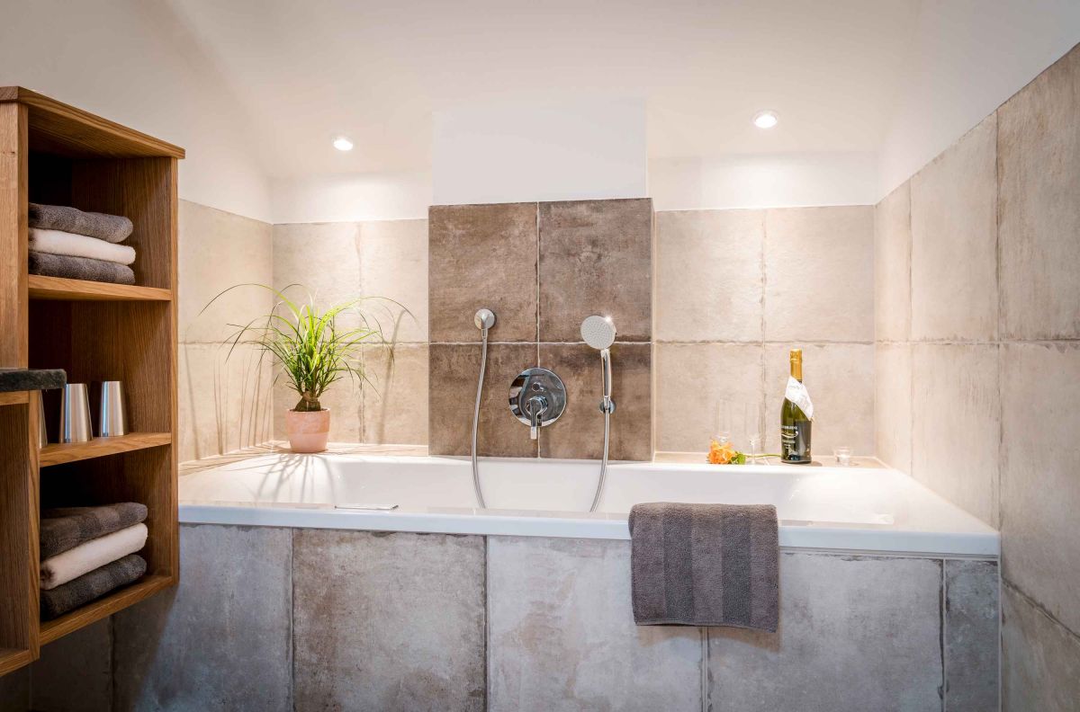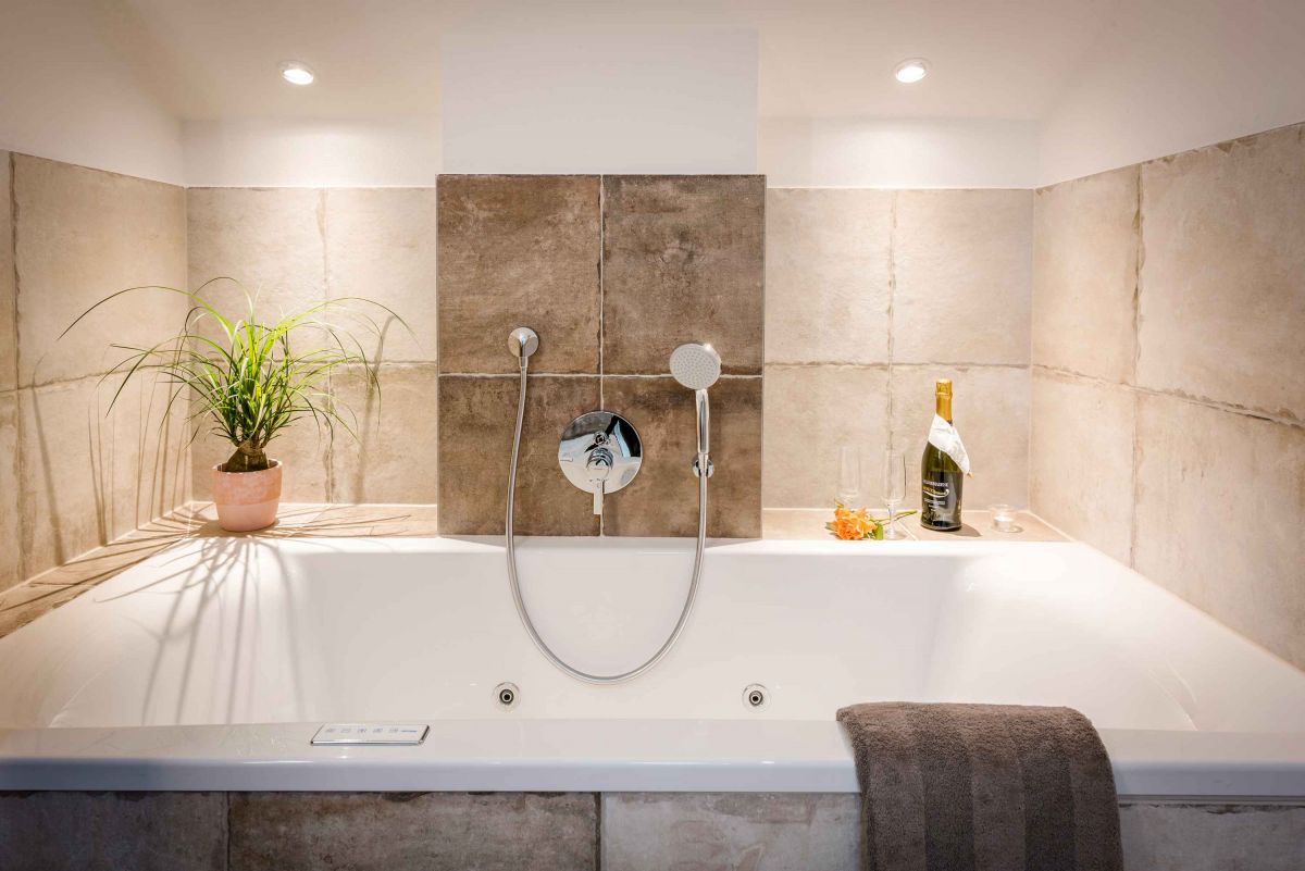 - 1 Badezimmer mit Regendusche, Whirlwanne mit Sprudel- und Massagedüsen, WC, ein großes Waschbecken, Handtuchwärmer, Schminkspiegel und Fön
