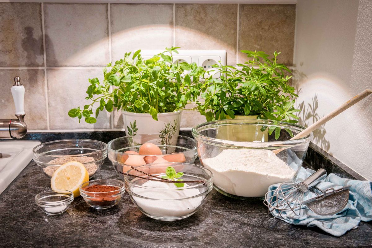 - komplett ausgestattete Küche mit E-Herd, Backofen, Kühlschrank mit Gefrierfach, Mikrowelle, Geschirrspüler, Kaffeemaschine, Wasserkocher, Eierkocher, Handrührgerät, Stabmixer und Toaster