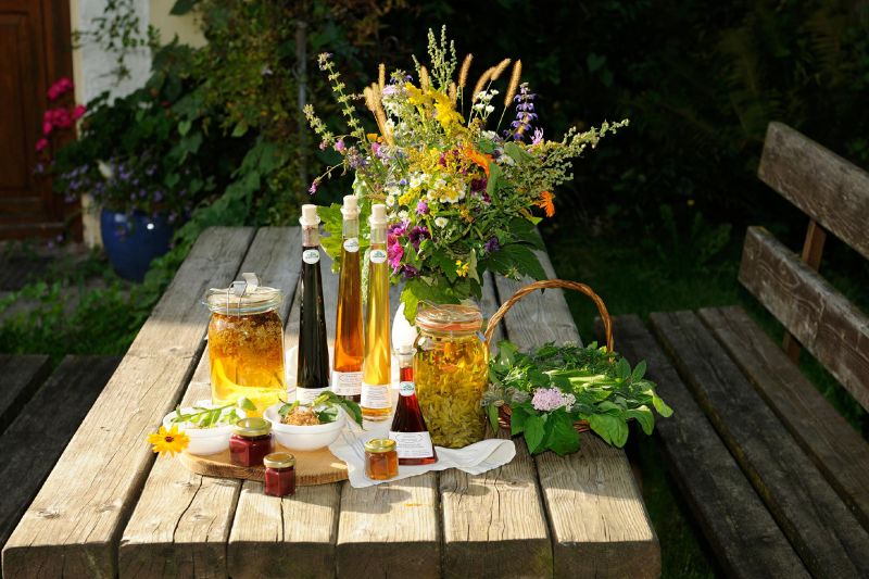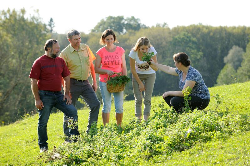 In Evis liebevoll gepflegtem Bauerngarten wachsen neben den traditionellen Gemüsen und Blumen manche vermeintliche „Unkräuter“, die sie gerne zeigt und mit ihren verschiedenen Wirkungen erklärt. Zur rechten Zeit können interessierte Gäste auch bei der Kräuterernte mithelfen oder bei einer Kräuterwanderung die Wildpflanzen rund um den Hof kennenlernen.