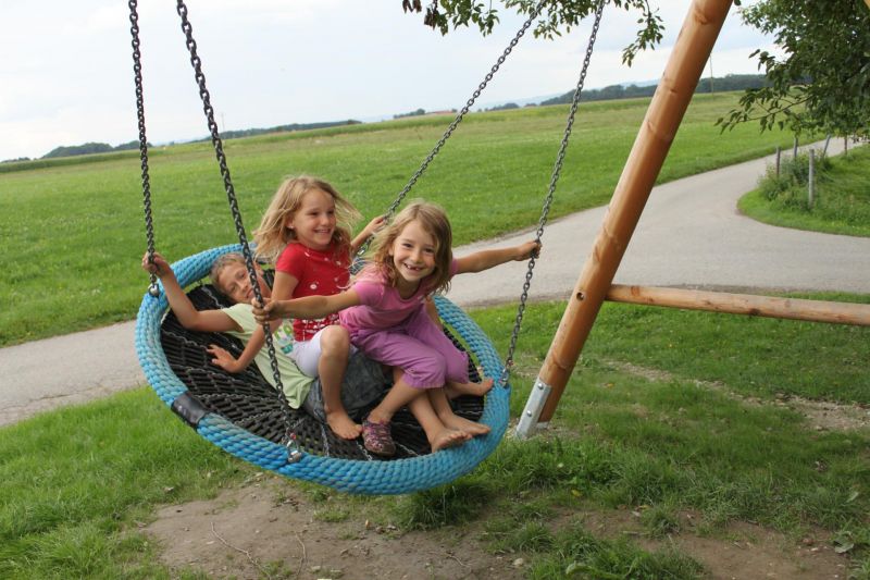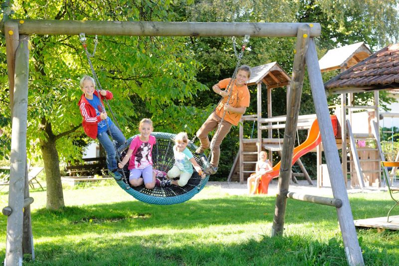 Auf dem Thomahof wird es bestimmt nicht langweilig - auf unserem abenteuerlichen Spielplatz geht's rund! Viel Platz zum Spielen und Toben für die Kinder gibt es auf unserer großen Spielwiese, die mit zwei Karussells, Rutsche, Wippe, Vogelnest-Schaukel, Abenteuerseilbahn und Fußballtoren ausgestattet ist.